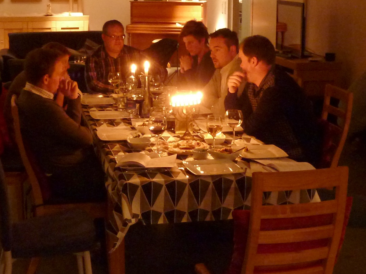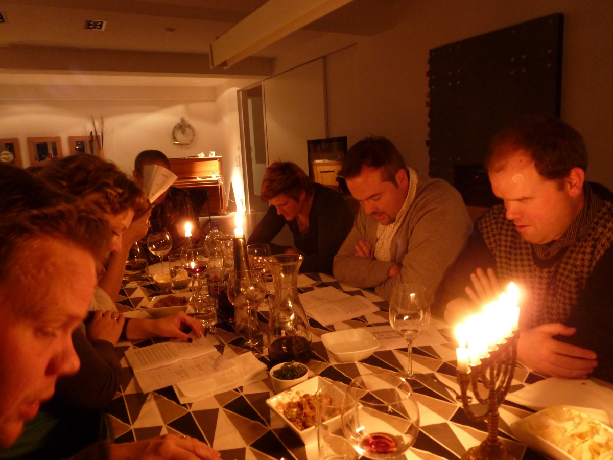 Nach der rituellen Händewaschung und der Begrüßung durch den Hausherrn wird feierlich das Licht des sieben-armigen Leuchters entzündet |